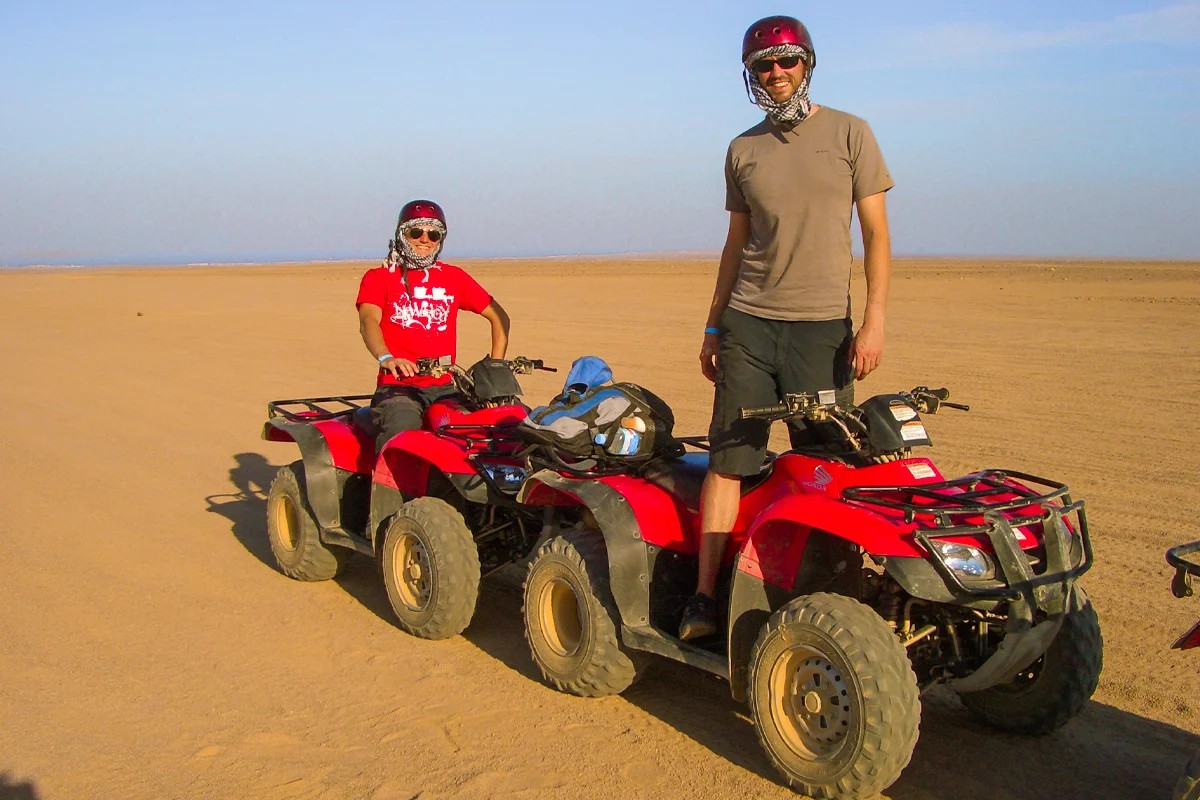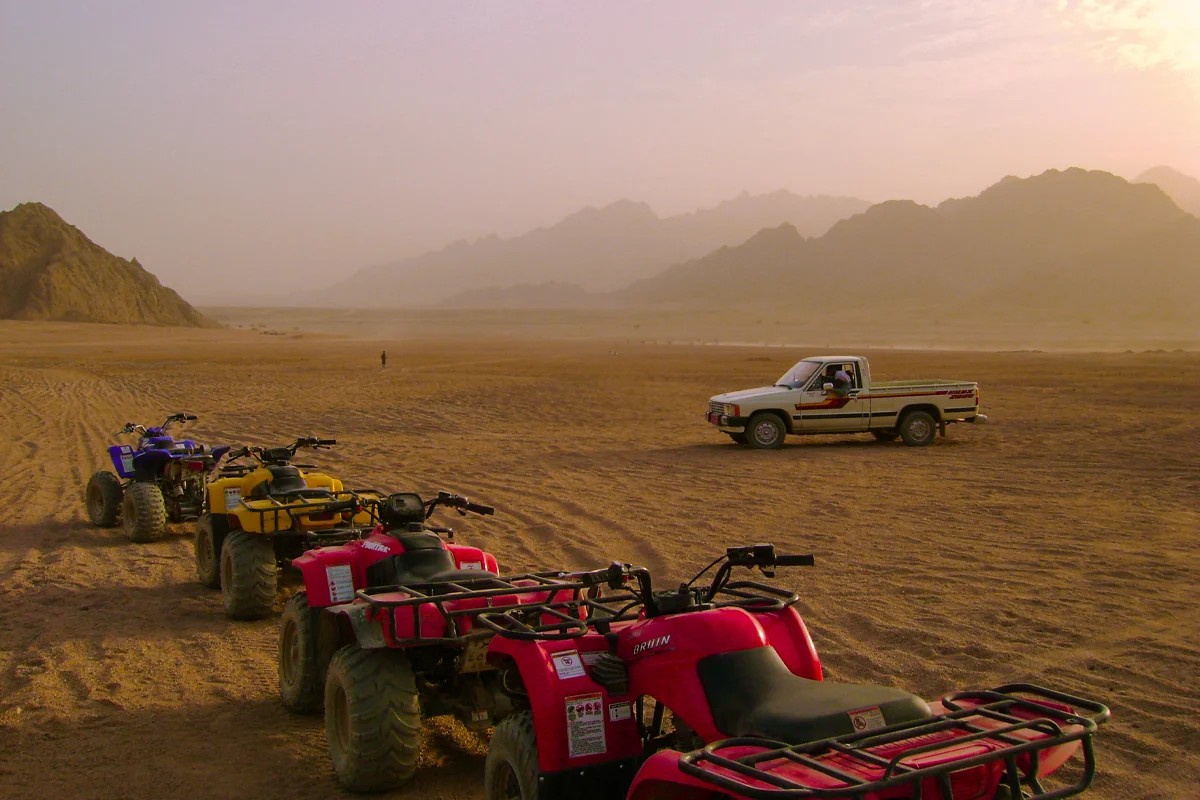 Embark on an exhilarating Desert Safari Trip by Quad Bike, starting with a comfortable pick-up at 9:00 AM from your Hurghada hotel. Our expert guides provide safety instructions before a 12-mile quad bike adventure through stunning dunes, accompanied by a captivating sunrise. Explore an authentic Bedouin village, enjoying their hospitality, “welcome tea,” and shisha. Return with unforgettable memories to your hotel, relishing the Egyptian desert’s beauty and rich culture—book today for an exciting, safe, and awe-inspiring experience in the mesmerizing landscapes of the Sahara.
